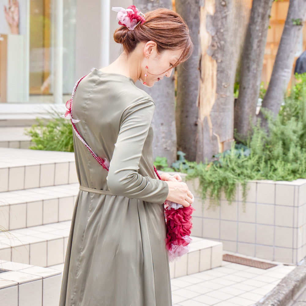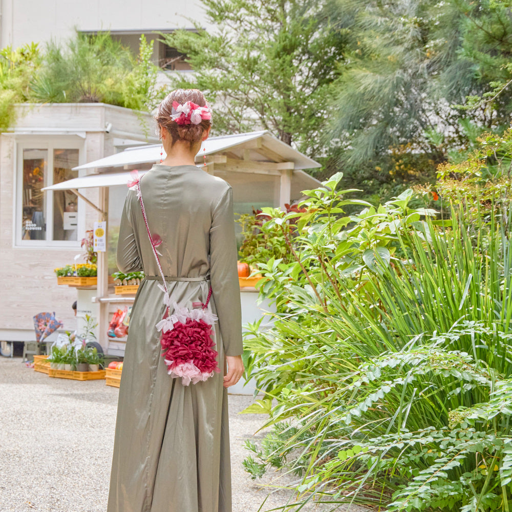 オーガンジーが光を通して色がまじりあうと、景色に溶け込み、ファッションになじみます。ちょっとレトロなカフェにも、ドレスアップして出かけたいレストランにも。