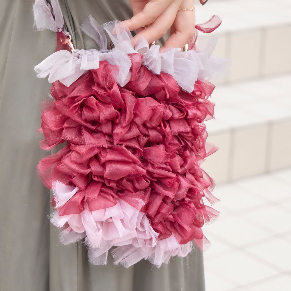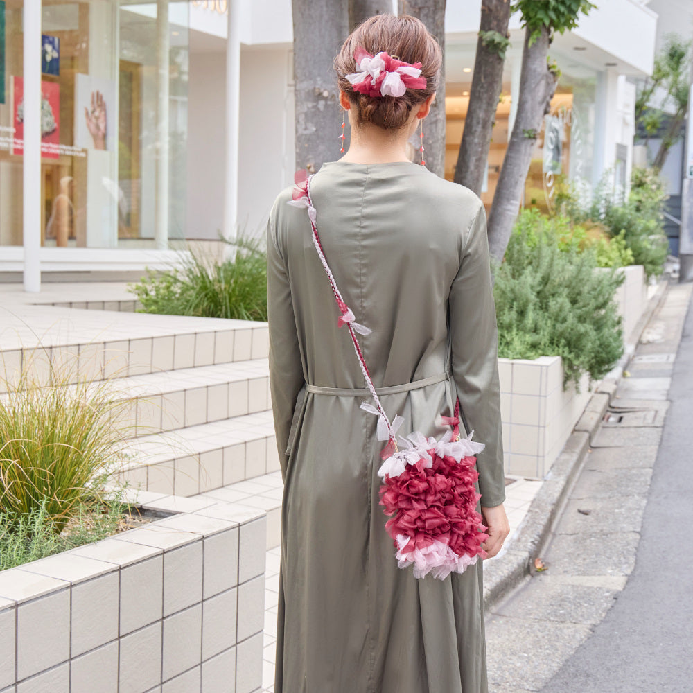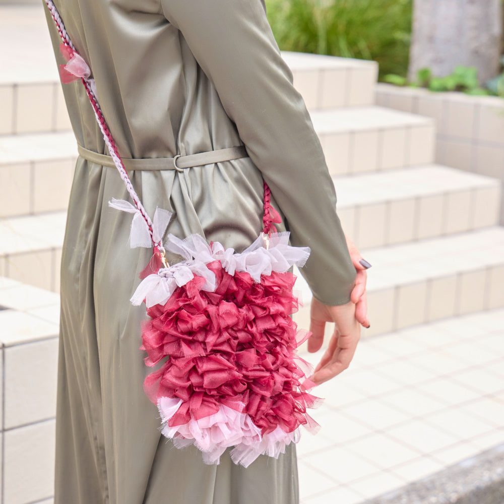 ふわんとした咲き編みは、オーガンジーから生まれます。 オーガンジーとは、薄くて軽く、ハリのある風合いの固い手織りの平織物のことを言います。 光を通すので、独特の柔らな雰囲気を持ちつつ上品な透け感が透明感を演出し、独特の光沢感と弾力性が特徴です。 あらゆる生地を裂いた結果、chikoでは強度が強く品質が安定しているポリエステルオーガンジーを使用しています。