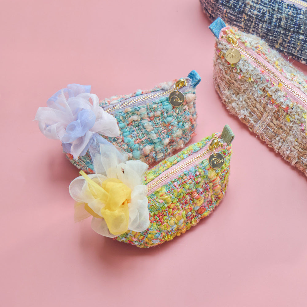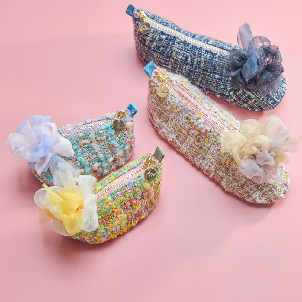 上質なインポートツイード生地と咲き編みフラワーが、かたちだけでなく気持ちまでふんわりとやさしくさせてくれます。